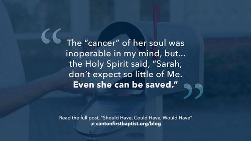 That really struck me. I started thinking, “Who do I know who has cancer of their souls?” The Holy Spirit brought my grandmother, Maw-Maw, to my mind. Maw-Maw is my father’s mother, she’s fiercely loyal, has always been an attentive grandmother to me and she sends EVERYONE in her life a card for every occasion. But she’s had a very hard life. Some of the hardships she’s known have been beyond her control, but some were due to her own choices. She does not have Jesus in her heart. She’s sad, sick in her spirit, and I think I’ve just always viewed her as hopeless.