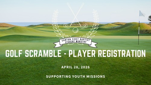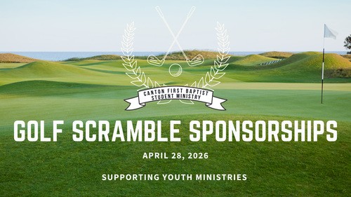Join the Canton First Baptist Student Ministry as we host our annual golf scramble. Taking place on April 28, 2026 at The Fairways of Canton. Register yourself or your team to support the youth ministries of Canton First Baptist.