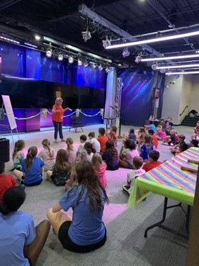 In the 11:00 AM hour, elementary school children will gather in the kids' Main Stage theater for worship, games, and Bible-based teaching. Preschool children will remain in their classrooms for continued lessons and activities.